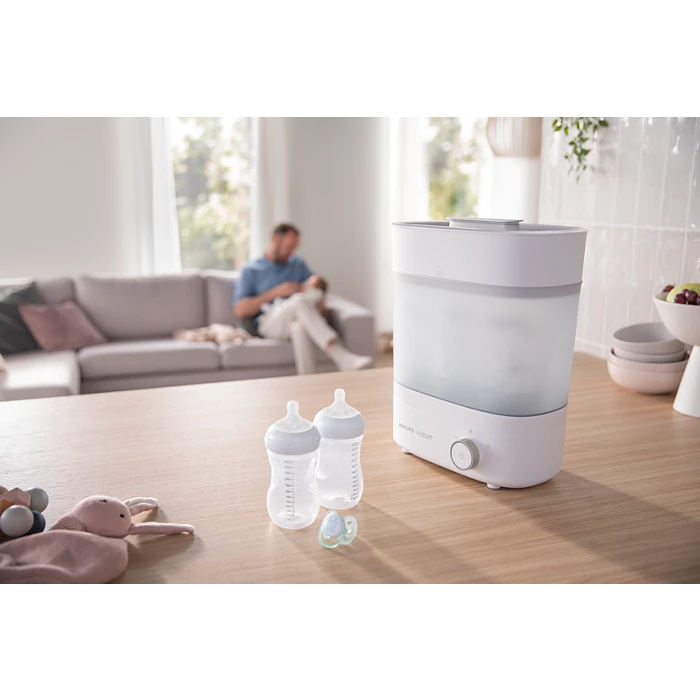 Preparati per la poppata del bambino in 40 minuti. Lo sterilizzatore e asciugatrice per biberon Premium utilizza getti di aria filtrata per asciugare i biberon prima di spegnersi. Lo sterilizzatore è rapido e igienico, eliminando il 99,9% dei germi* per offrire la massima tranquillità a ogni poppata.