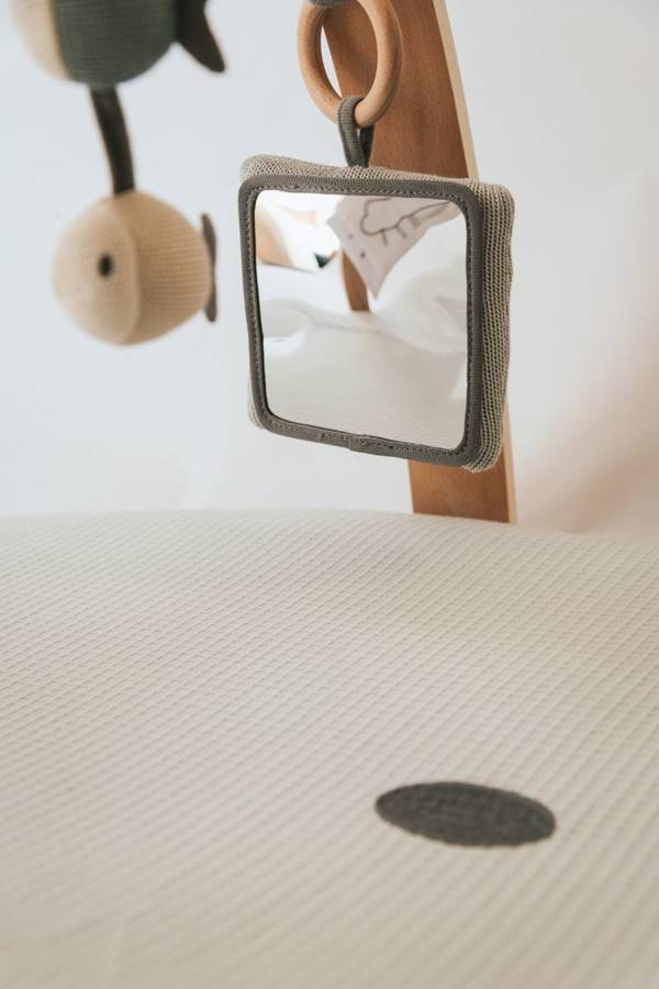 Per arricchire ulteriormente l’esperienza di gioco, il tappeto è dotato di trombette che catturano l’attenzione del bambino, oltre ad accessori come un libro sensoriale, uno specchio e un sonaglio per stimolare l’interazione.