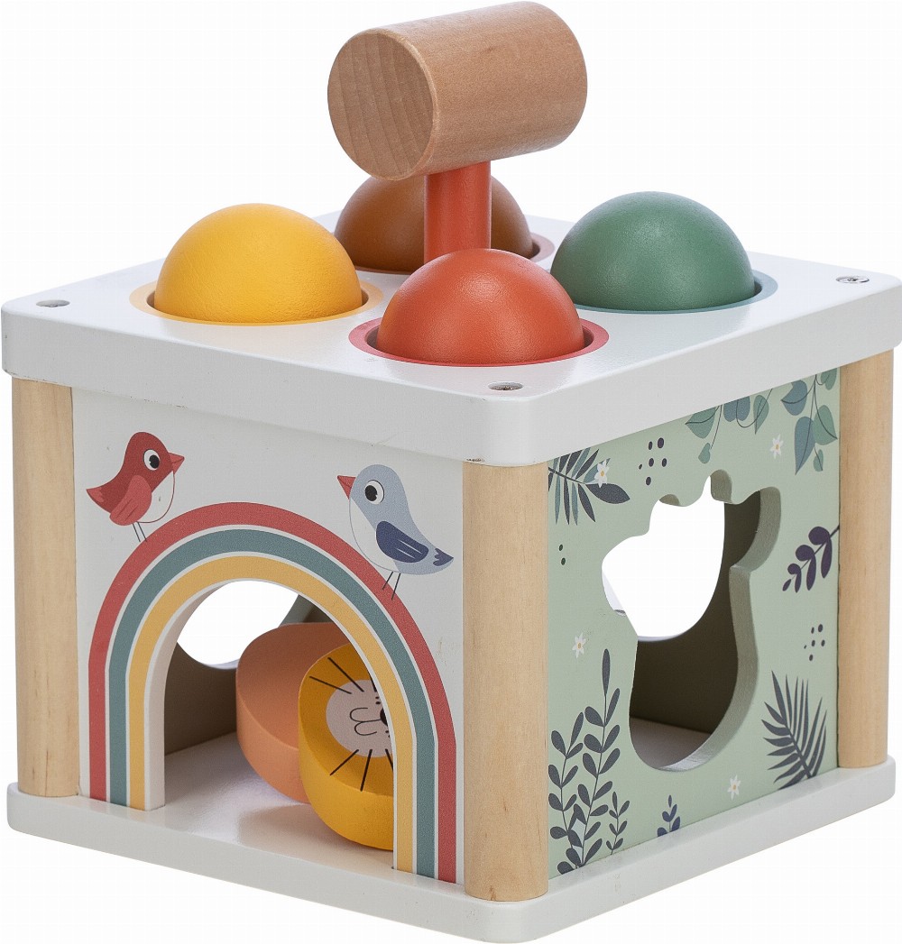 Usa il martello per colpire le palline all’interno della casa. La casa include personaggi che il bambino può spingere attraverso le aperture. Un gioco eccellente per allenare la motricità fine e la coordinazione occhio-mano.