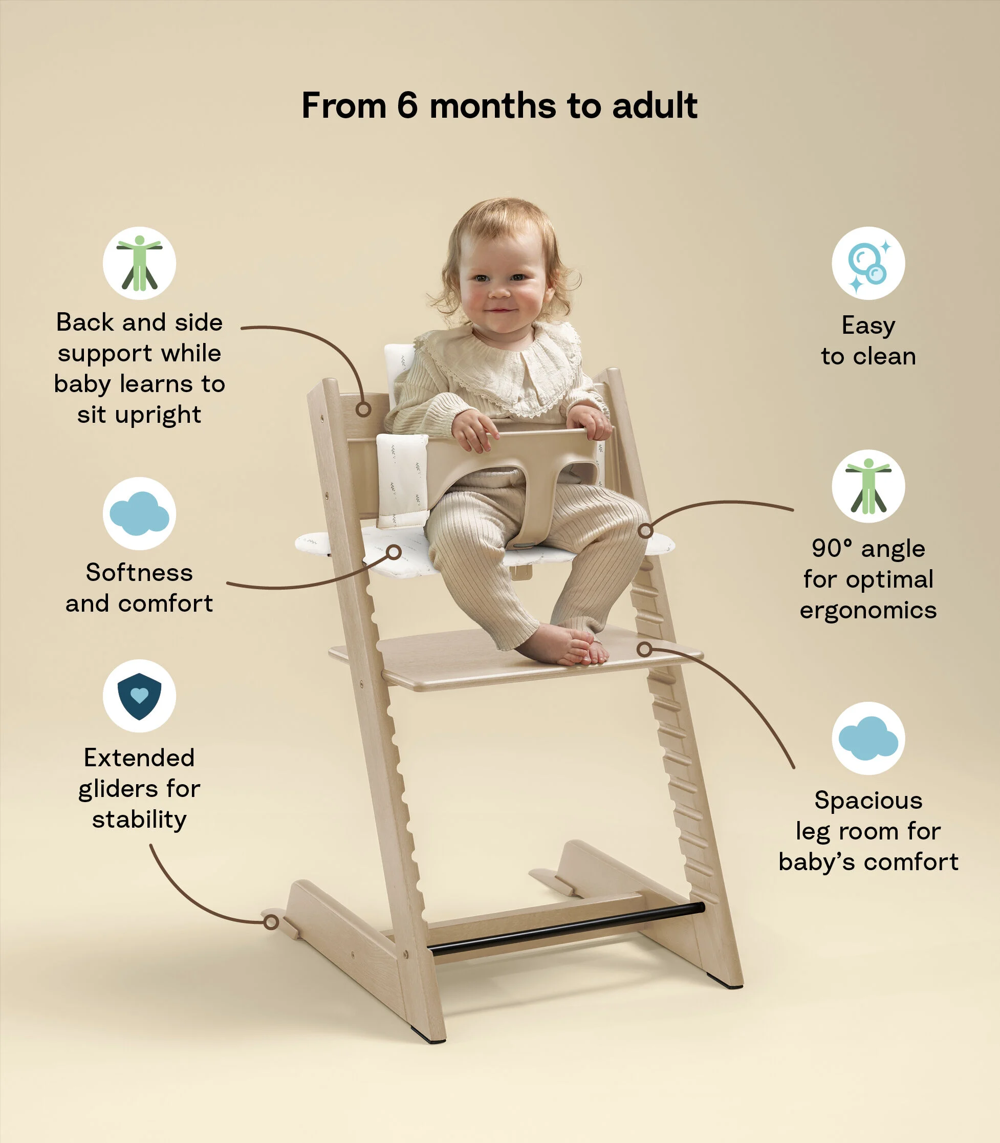 Il Tripp Trapp® Baby Set può essere utilizzato con il vassoio Stokke® e l’imbracatura Stokke®.