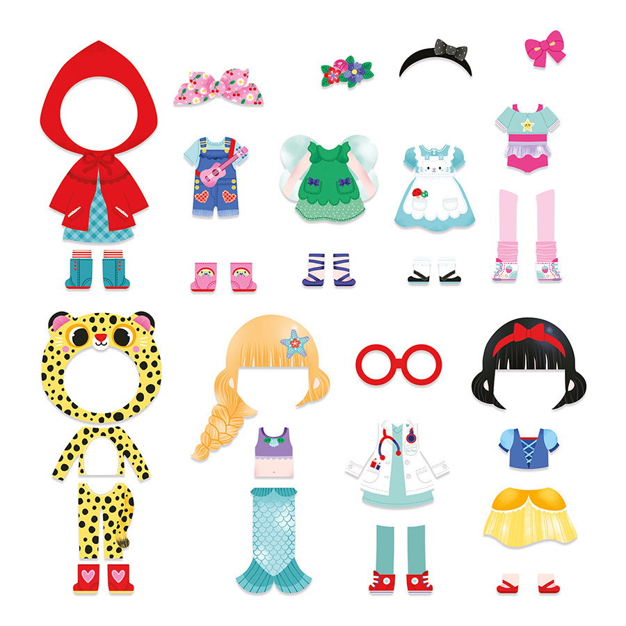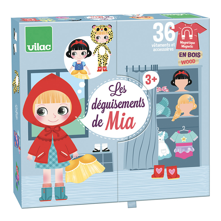 Vesti Mia, una graziosa bambola magnetica di legno che puoi vestire come preferisci. Cofanetto composto da 36 elementi e dalla sua bambola magnetica alta 22 cm. A partire dai 3 anni.